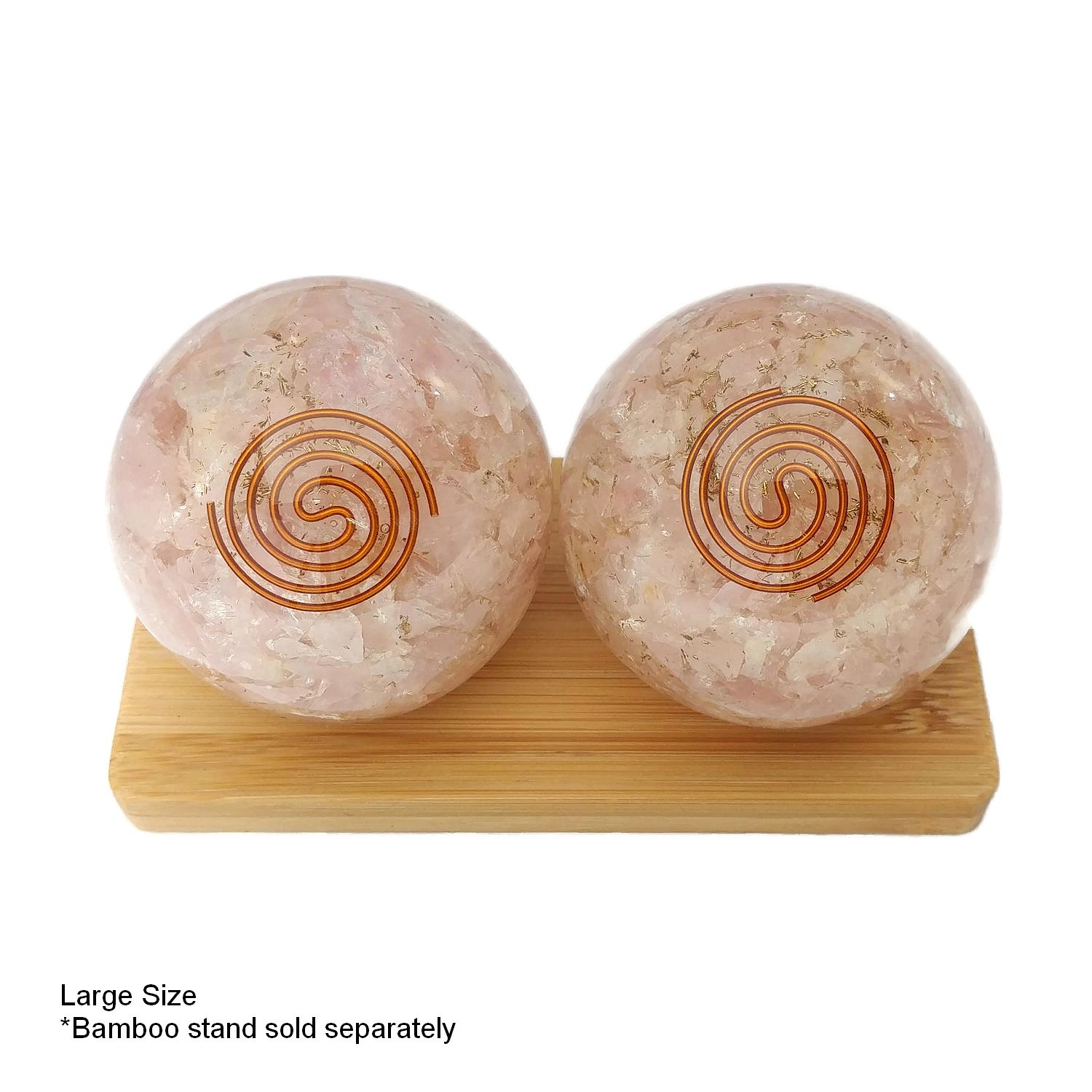 These baoding balls are made into orgonite with a combination of rose quartz stone cast in resin with a copper spiral for channeling energy. A user of orgonite uses the object for its bio-energy, protective, and spiritual properties.